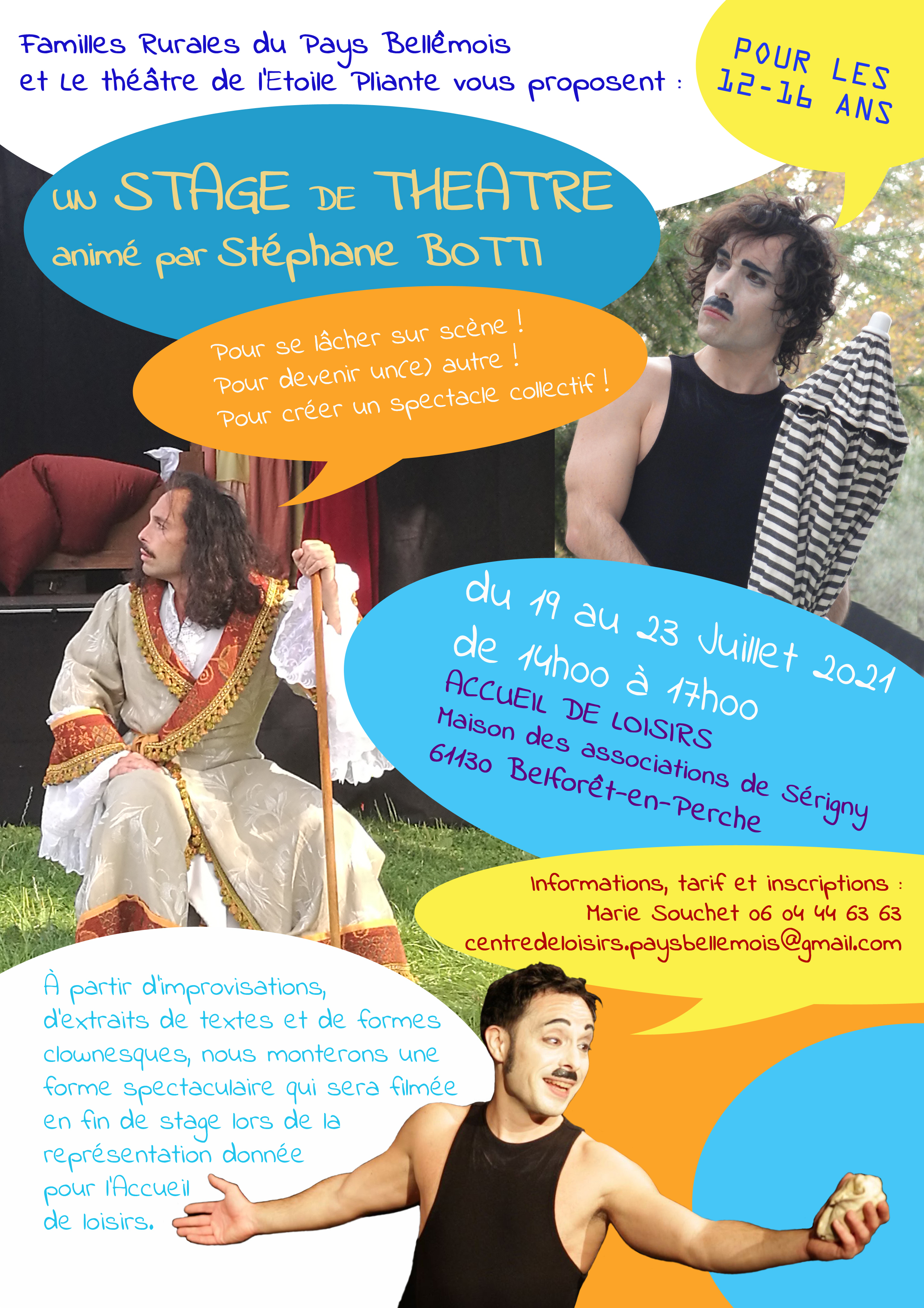 À partir d’improvisations, d’extraits de textes et de formes clownesques, nous monterons une forme spectaculaire qui sera filmée en fin de stage lors de la représentation donnée pour les enfants de l’Accueil de loisirs.